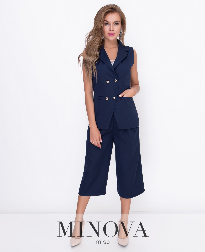 Кюлоты с поясом на высокой посадке застегиваются на две пуговицы и молнию. В брюках присутствуют карманы.