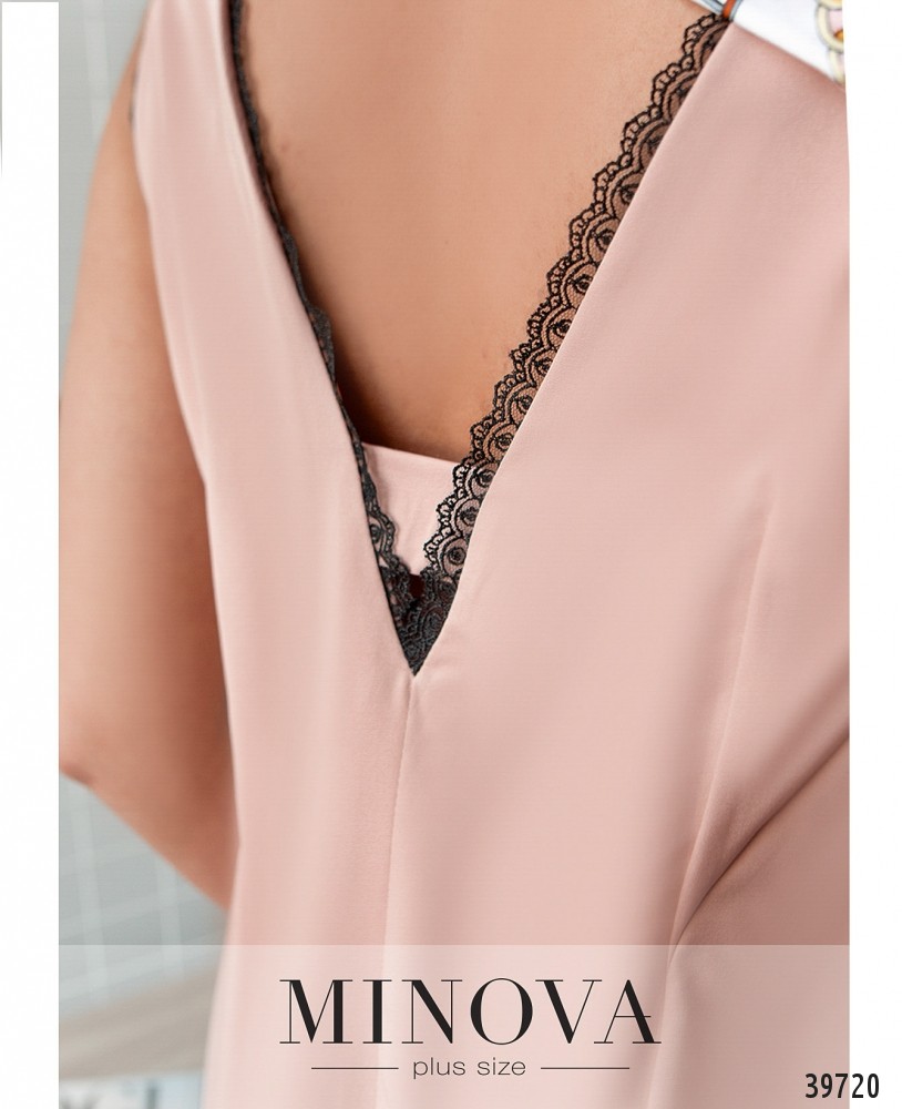 Лёгкая майка плюс сайз с вытачками на груди, украшена тонким кружевом, вырез горловины сзади и спереди V-образный, по спинке - с небольшой поперечной лентой.