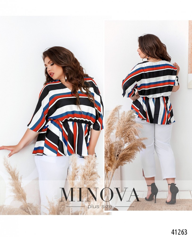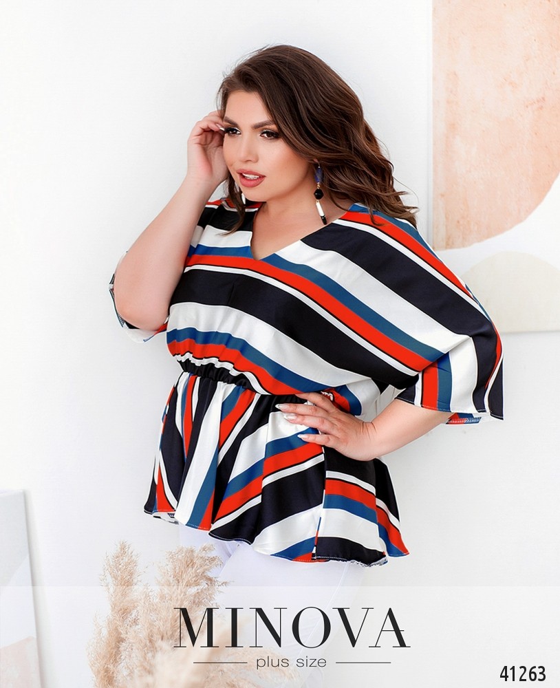 Элегантная, очень радостная и яркая блуза большого размера со вшитой в пояс резинкой и асимметричным подолом. Рукав свободный, без манжет. Карманов нет. Вырез горловины неглубокий.