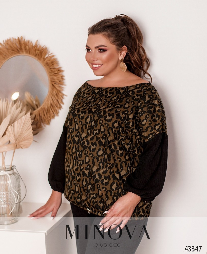 Яркая кофточка большого размера с широким вырезом горловины, без застёжек и карманов, снизу через подол пропущен шнурок. Рукава из другого типа ткани, в манжеты вшита резинка.