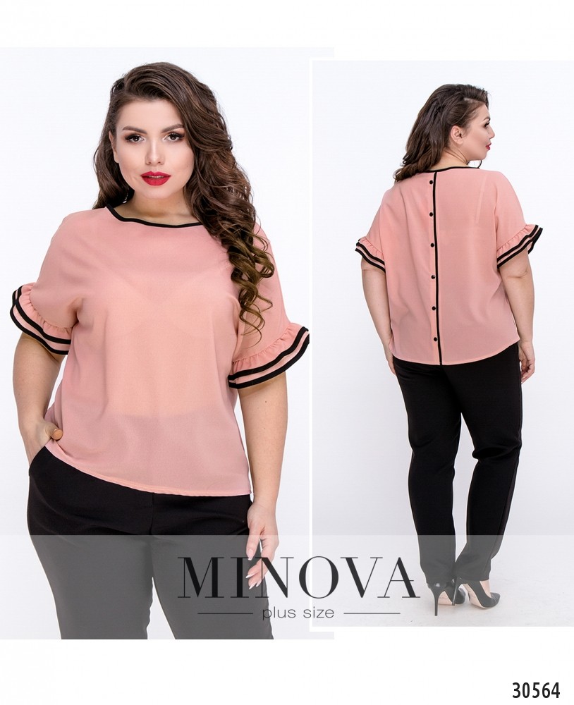 Свободная блуза прямого кроя с рукавами –воланами. Спинка украшена рядом декоративных пуговиц. Горловина, рукава и планка на спине выделены контрастным кантом.
