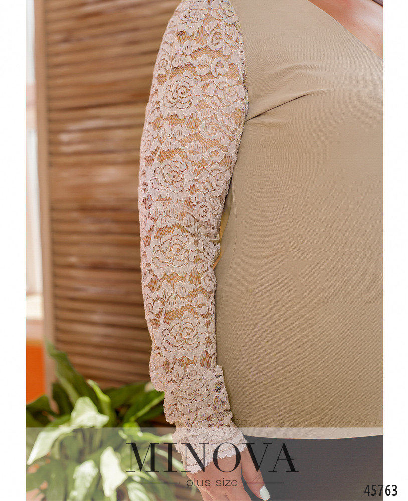 Нежная однотонная блуза добавит в ваш образ чуточку кокетства, романтизма и женственности. Изюминкой данной модели являются глубокий V-образный вырез и длинные кружевные рукава, подчеркивающие красоту ваших рук.