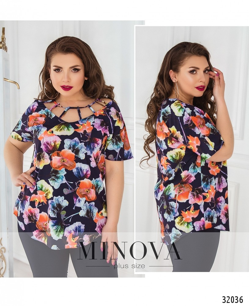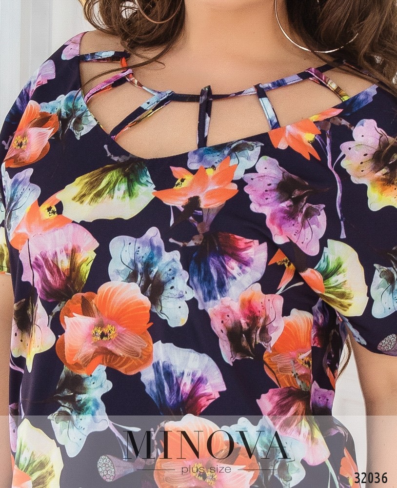 Яркий топ с оригинальной горловиной. Топ прямого кроя с короткими рукавами и закругленным подолом. V-образное декольте украшено декоративными петельками.
