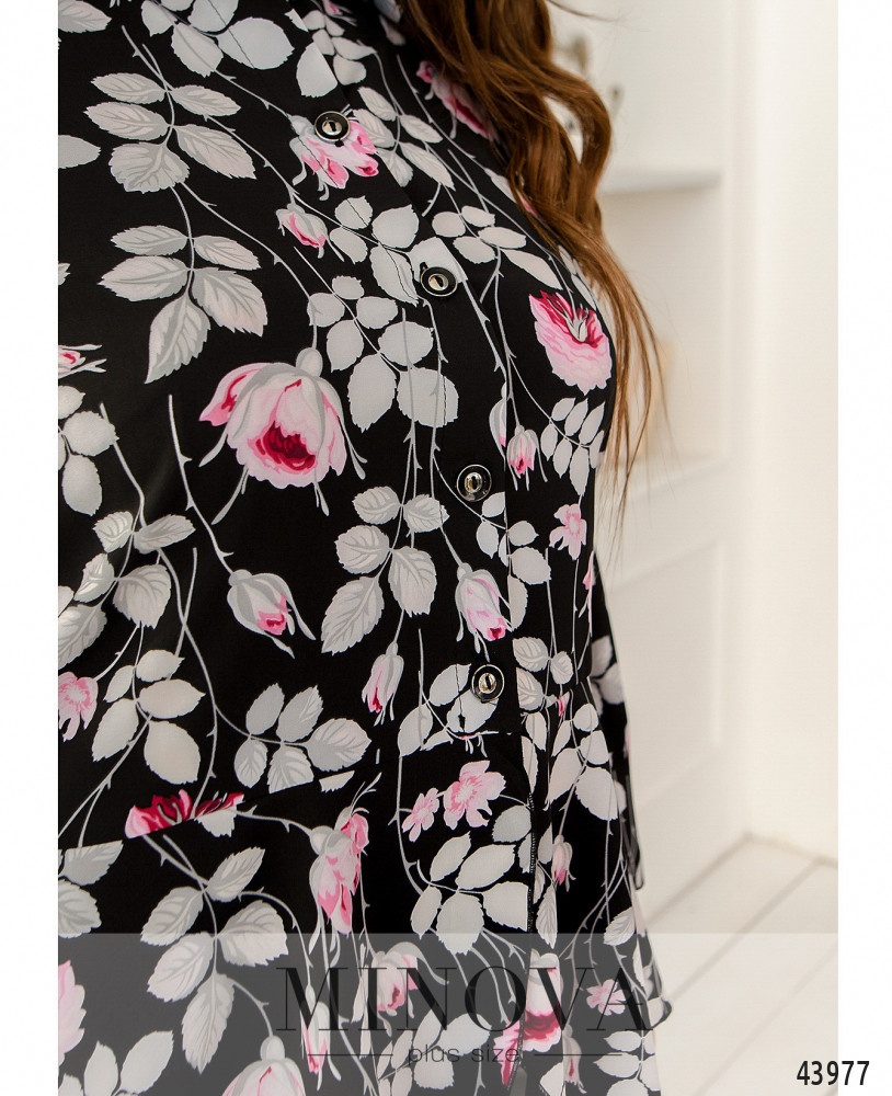 Элегантная блуза батал с нежным принтом, воротничок отложной, спереди - ряд пуговиц на планке. Рукава с манжетами, на манжетах по одной пуговке. Снизу к подолу подшиты мягкие оборки. На груди вытачки. Карманов нет.