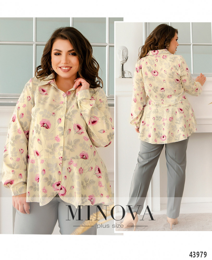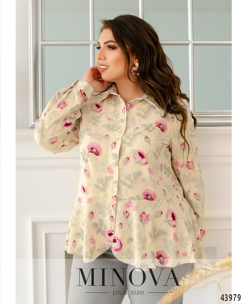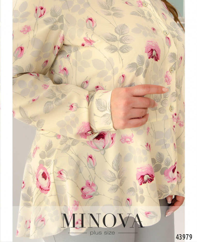Элегантная блуза батал с нежным принтом, воротничок отложной, спереди - ряд пуговиц на планке. Рукава с манжетами, на манжетах по одной пуговке. Снизу к подолу подшиты мягкие оборки. На груди вытачки. Карманов нет.