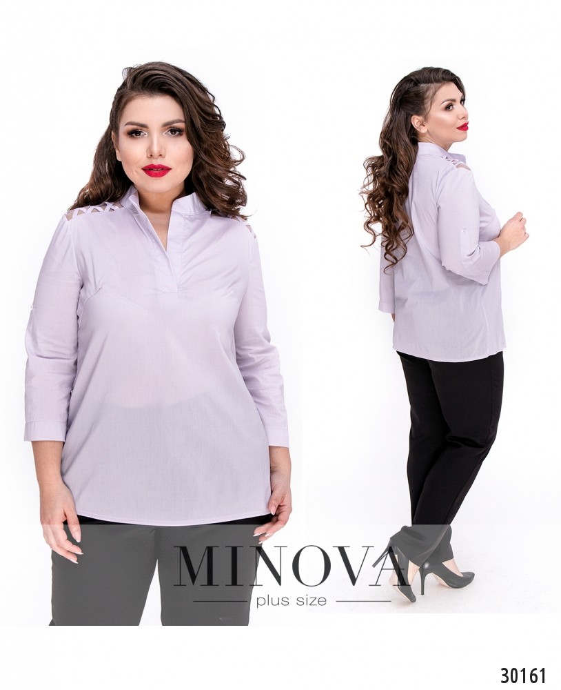 Блуза прямого кроя с V-образным вырезом и рукавами ¾. Рубашка украшена сеткой и шнуровкой на плечах. Вырез оформлен воротником-стойкой. Рукава подворачиваются и крепятся на пуговицу с планкой.