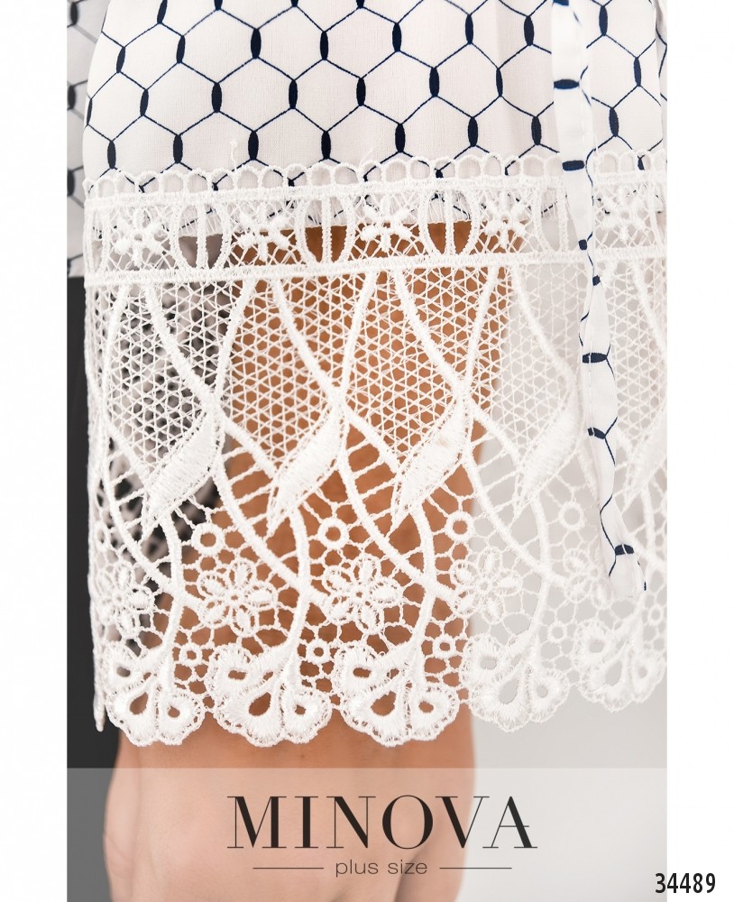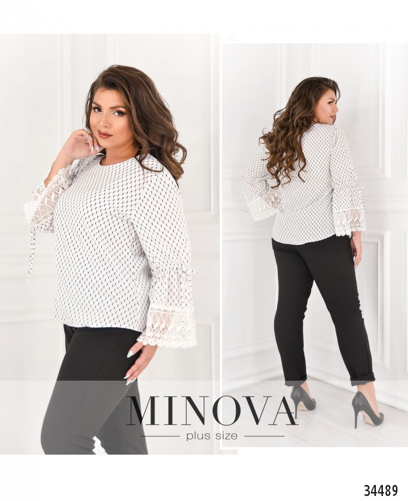 Кружево способно сделать даже самую простую блузу очень нарядной! Minova представляет именно такую модель блузы батал: свободного кроя, из очень лёгкой ткани, с полукруглым широким вырезом горловины. Блуза без застёжек, карманов и вытачек, с двойным рукавом, который расширяется на месте манжета. В месте расширения пропущен шнурок, который можно затянуть потуже, а сам манжет украшен очень нежным, ажурным и элегантным кружевом. Принт – едва заметный, в виде шестиугольников по типу пчелиных сот. Маленький, но важный декоративный элемент сделает ваш повседневный или деловой образ изысканным и привлекательным! Такую модель стоит носить навыпуск с джинсами или брюками.