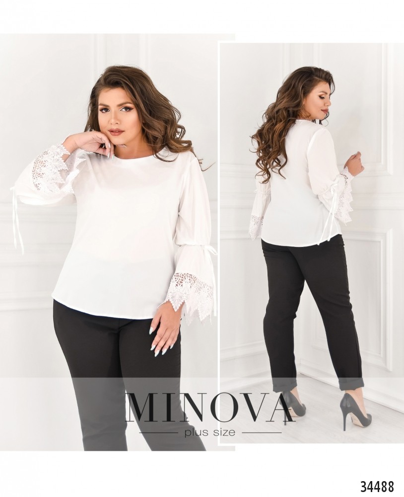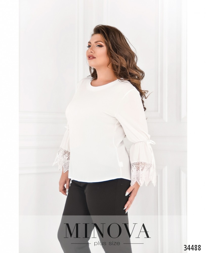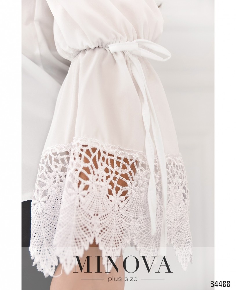 Кружево способно сделать даже самую простую блузу очень нарядной! Minova представляет именно такую модель блузы батал: свободного кроя, из очень лёгкой ткани, с полукруглым широким вырезом горловины. Блуза без застёжек, карманов и вытачек, с двойным рукавом, который расширяется на месте манжета. В месте расширения пропущен шнурок, который можно затянуть потуже, а сам манжет украшен очень нежным, ажурным и элегантным кружевом. Принт – едва заметный, в виде шестиугольников по типу пчелиных сот. Маленький, но важный декоративный элемент сделает ваш повседневный или деловой образ изысканным и привлекательным! Такую модель стоит носить навыпуск с джинсами или брюками.