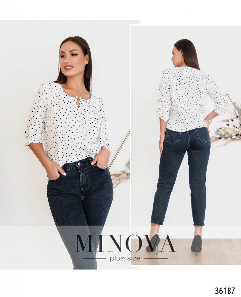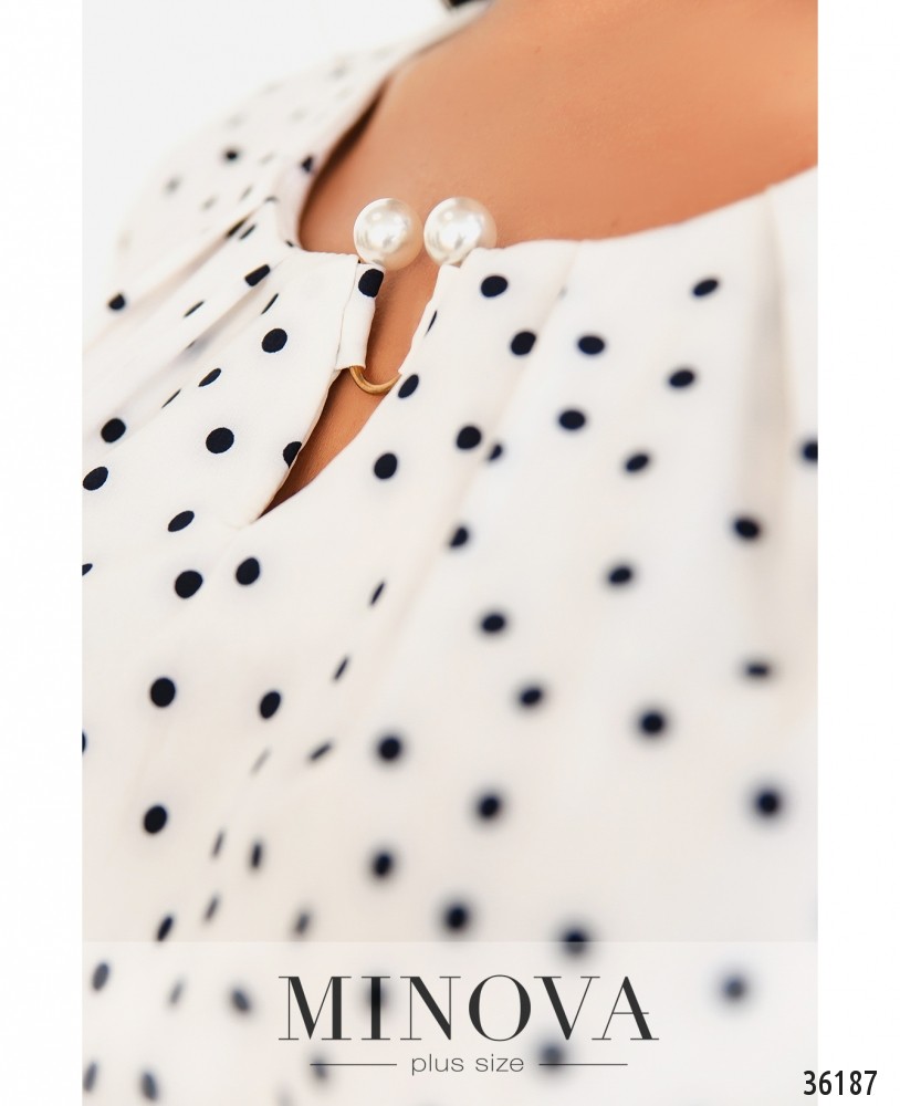 Приятная нарядная блуза батал из новой коллекции Minova представлена в нескольких оттенках и принтах – в «соты», в горошек или без принта. Цвета – яркие и пастельные. Блуза из лёгкой ткани, с рукавами полной длины, которые могут регулироваться с помощью пуговки и ленты. На рукавах – небольшие манжеты с одной пуговицей. Вырез горловины полукруглый, неглубокий, по центру вставлено металлическое украшение с «жемчужными» наконечниками. Ткань от горловины присобрана по диагонали, так что будет хорошо сидеть даже на объёмном бюсте. Застёжек и карманов нет. Можешь сочетать блузу со строгими брюками или любимыми удобными джинсами.