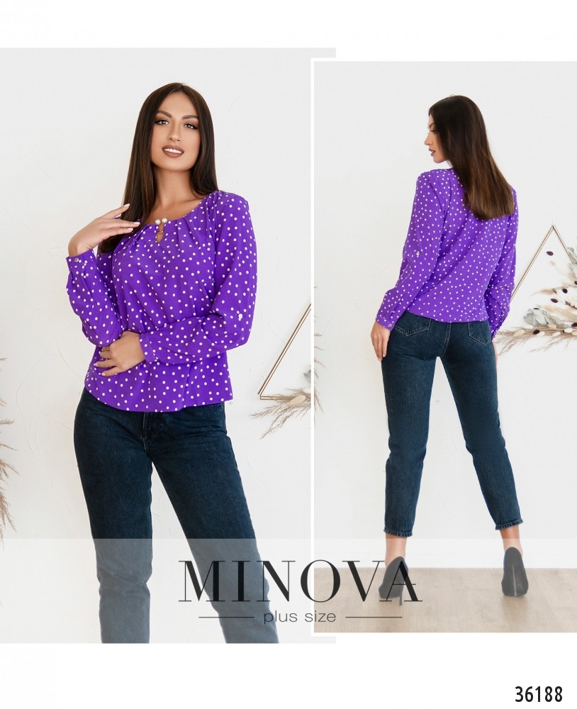 Приятная нарядная блуза батал из новой коллекции Minova представлена в нескольких оттенках и принтах – в «соты», в горошек или без принта. Цвета – яркие и пастельные. Блуза из лёгкой ткани, с рукавами полной длины, которые могут регулироваться с помощью пуговки и ленты. На рукавах – небольшие манжеты с одной пуговицей. Вырез горловины полукруглый, неглубокий, по центру вставлено металлическое украшение с «жемчужными» наконечниками. Ткань от горловины присобрана по диагонали, так что будет хорошо сидеть даже на объёмном бюсте. Застёжек и карманов нет. Можешь сочетать блузу со строгими брюками или любимыми удобными джинсами.