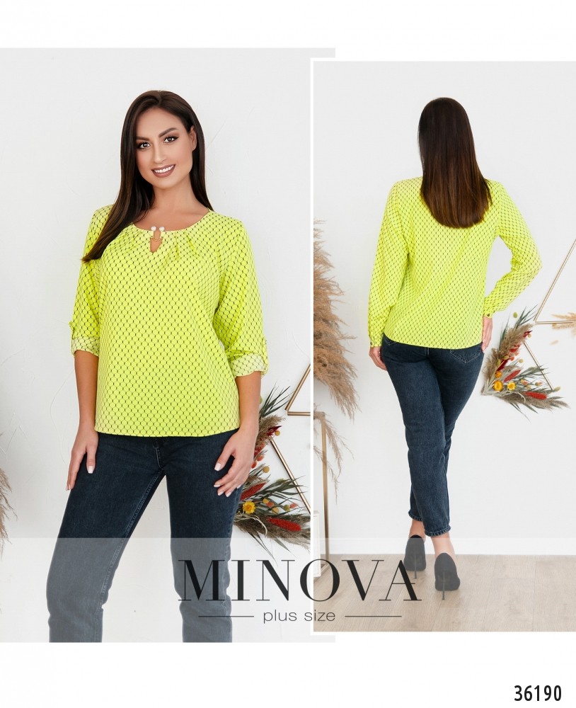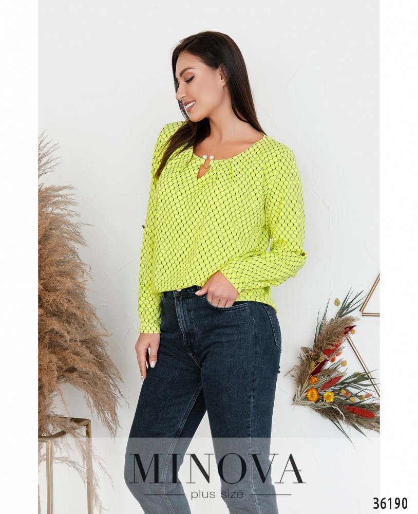 Приятная нарядная блуза батал из новой коллекции Minova представлена в нескольких оттенках и принтах – в «соты», в горошек или без принта. Цвета – яркие и пастельные. Блуза из лёгкой ткани, с рукавами полной длины, которые могут регулироваться с помощью пуговки и ленты. На рукавах – небольшие манжеты с одной пуговицей. Вырез горловины полукруглый, неглубокий, по центру вставлено металлическое украшение с «жемчужными» наконечниками. Ткань от горловины присобрана по диагонали, так что будет хорошо сидеть даже на объёмном бюсте. Застёжек и карманов нет. Можешь сочетать блузу со строгими брюками или любимыми удобными джинсами.
