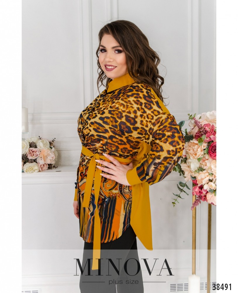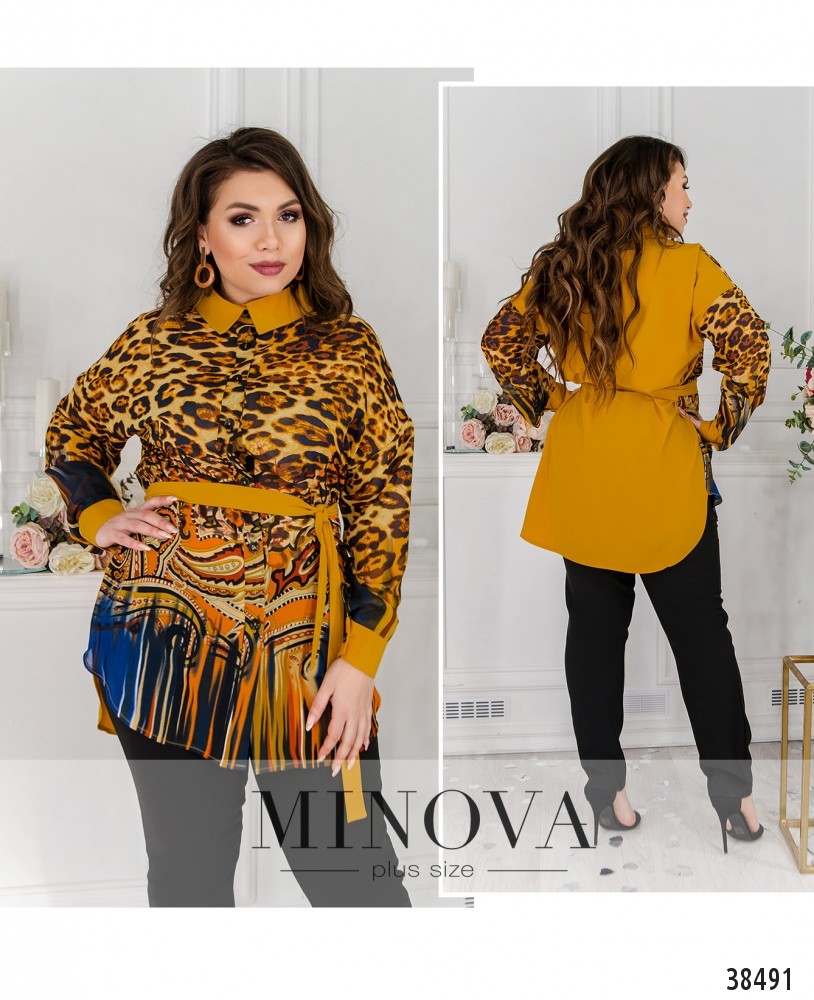 Яркая и очень привлекательная рубашка-туника большого размера с нарядным принтом спереди и однотонной спинкой. Рубашка с отложным воротничком, застёгивается на полный ряд пуговиц на планке спереди, по бокам - подшитый поясок. На рукавах - небольшие манжеты с небольшими пуговицами. Карманов нет. По бокам на подоле - небольшие разрезы.