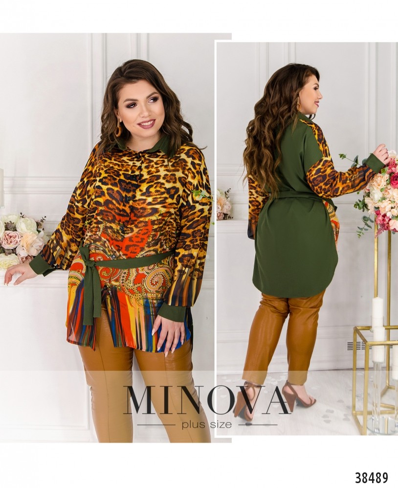 Яркая и очень привлекательная рубашка-туника большого размера с нарядным принтом спереди и однотонной спинкой. Рубашка с отложным воротничком, застёгивается на полный ряд пуговиц на планке спереди, по бокам - подшитый поясок. На рукавах - небольшие манжеты с небольшими пуговицами. Карманов нет. По бокам на подоле - небольшие разрезы.