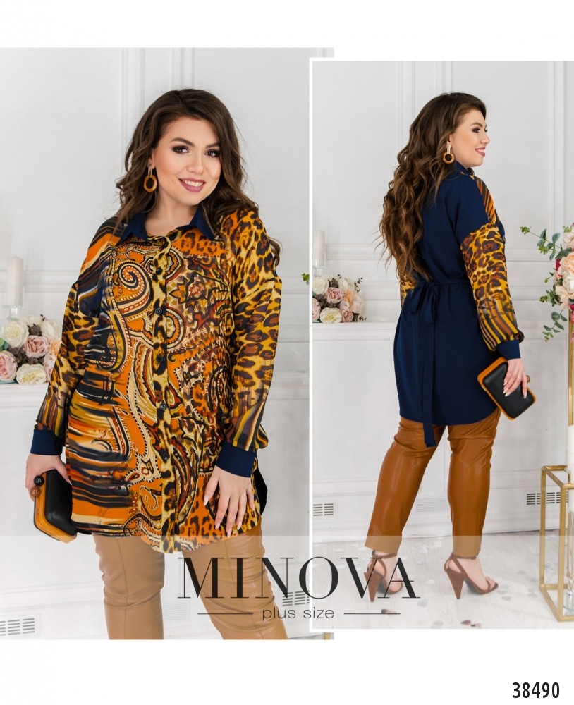 Яркая и очень привлекательная рубашка-туника большого размера с нарядным принтом спереди и однотонной спинкой. Рубашка с отложным воротничком, застёгивается на полный ряд пуговиц на планке спереди, по бокам - подшитый поясок. На рукавах - небольшие манжеты с небольшими пуговицами. Карманов нет. По бокам на подоле - небольшие разрезы.