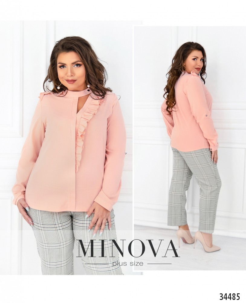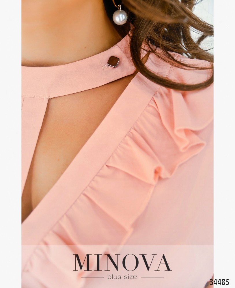 Любишь нестандартную одежду и такие фасоны, которых точно не встретишь в гардеробе своих подруг? Minova представляет модель рубашки батал, которая выглядит по-настоящему оригинально! На первый взгляд – классическая рубашка, но множество мелких деталей делают её неповторимой. Воротник-стоечка, застёгивается на одну пуговицу. Других застёжек на рубашке нет, но они и не нужны: от линии, где должны располагаться пуговицы, и до плеча – довольно глубокий треугольный вырез, отороченный оборками. На плечах тоже небольшие оборки в виде «погончиков». Рукава регулируются на ленту и пуговку, в наличии манжеты с одной пуговицей. Такая рубашка впишется в нестрогий дресс-код для неофициальных мероприятий, её можно носить с брюками, джинсами или юбкой прямого кроя.