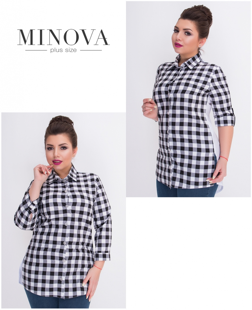 Приталенная рубашка на пуговицах с удлиненной спинкой и длинными рукавами. Рукава подкатываются и застегиваются на пуговицу. Подол с боковыми разрезами скруглен. Спинка украшена большой надписью из страз «SMILE ON YOU».