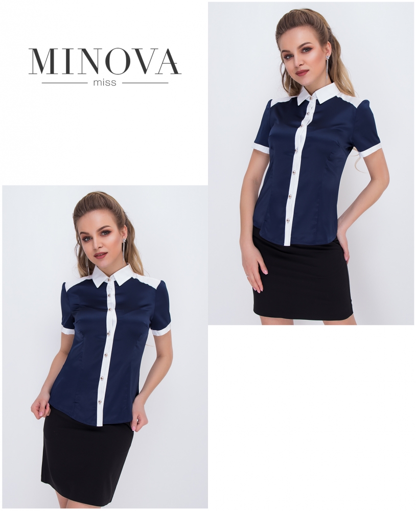Атласная приталенная рубашка на пуговицах с короткими рукавами и контрастными вставками.