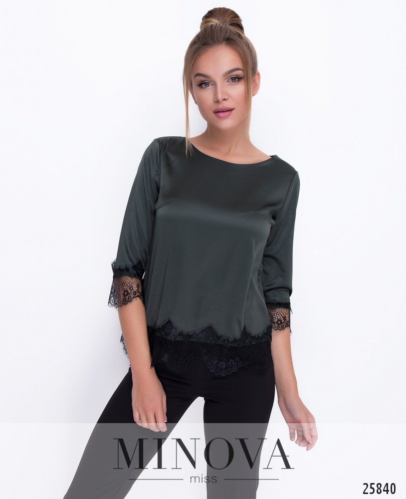 Атласная блуза прямого кроя с рукавами ¾в романтическом стиле. Рукава и подол обрамлены тонким кружевом.