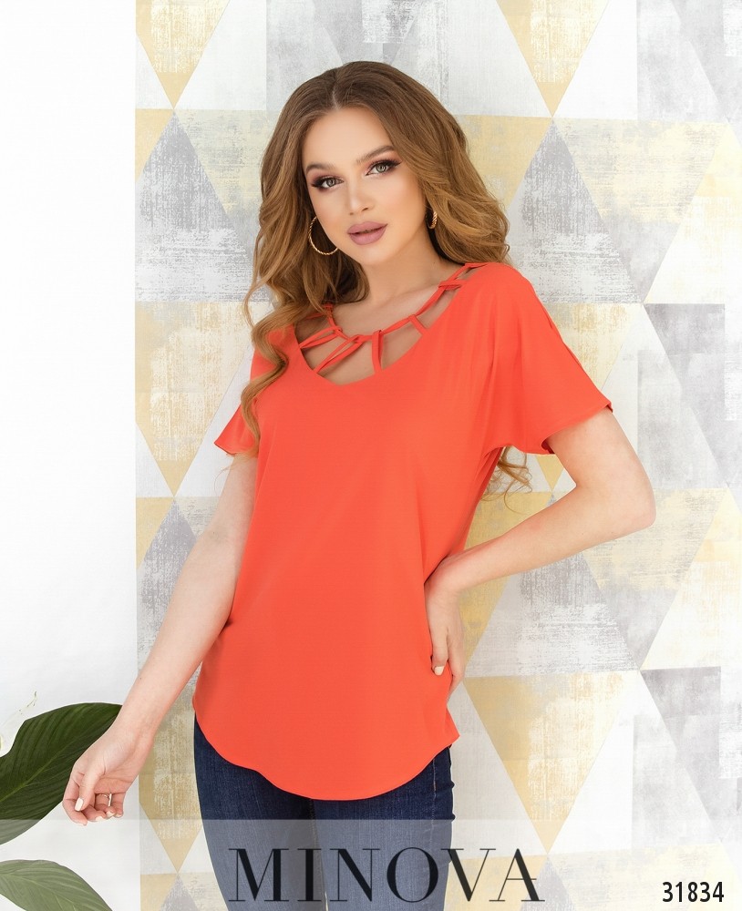 Яркий топ с оригинальной горловиной. Топ прямого кроя с короткими рукавами и закругленным подолом. V-образное декольте украшено декоративными петельками.