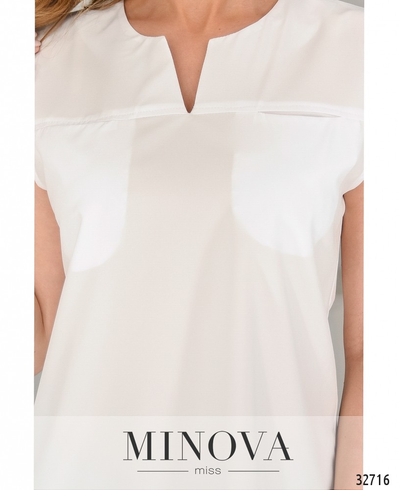 Аккуратная и строгая – это именно про блузку из новой коллекции Minova. Оптимальный вариант для случаев, когда летом нужно придерживаться официальных требований к одежде. Прямой крой уравновешивается V-образным углублением в полукруглом вырезе горловины и такими же ромбовидными вырезами для рук. Собственно рукавов нет, но плечи прикрыты, так что жарко не будет, и правила дресс-кода соблюдены. Застёжек нет, зато есть маленькие вшитые карманы на груди. Материал лёгкий, не тянется и не просвечивает.