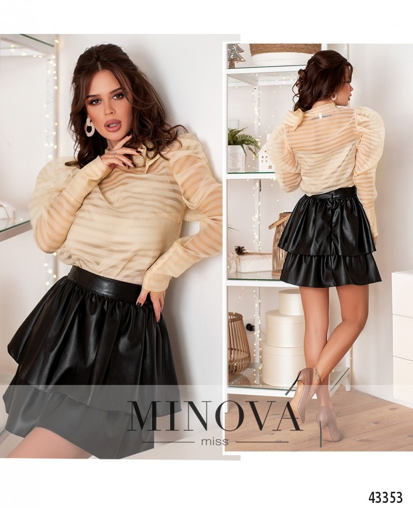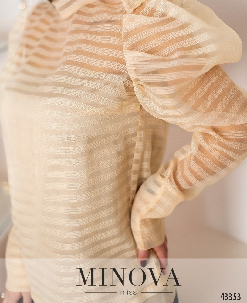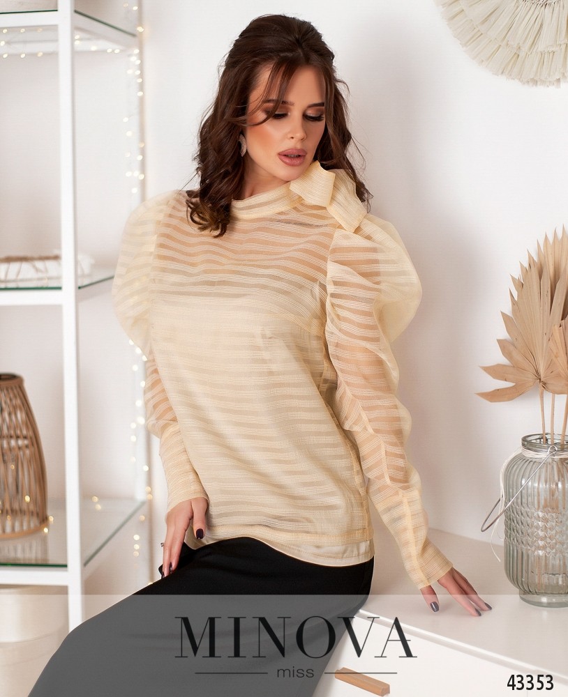 Элегантная рубашка с нижней майкой. Майка на лямках, с вытачками на груди, лямки не регулируются, застёжек и карманов нет. Верхняя кофта полупрозрачная, с лентами на воротнике, рукава с длинными манжетами без пуговиц, фасон "жиго". Без застёжек и карманов.