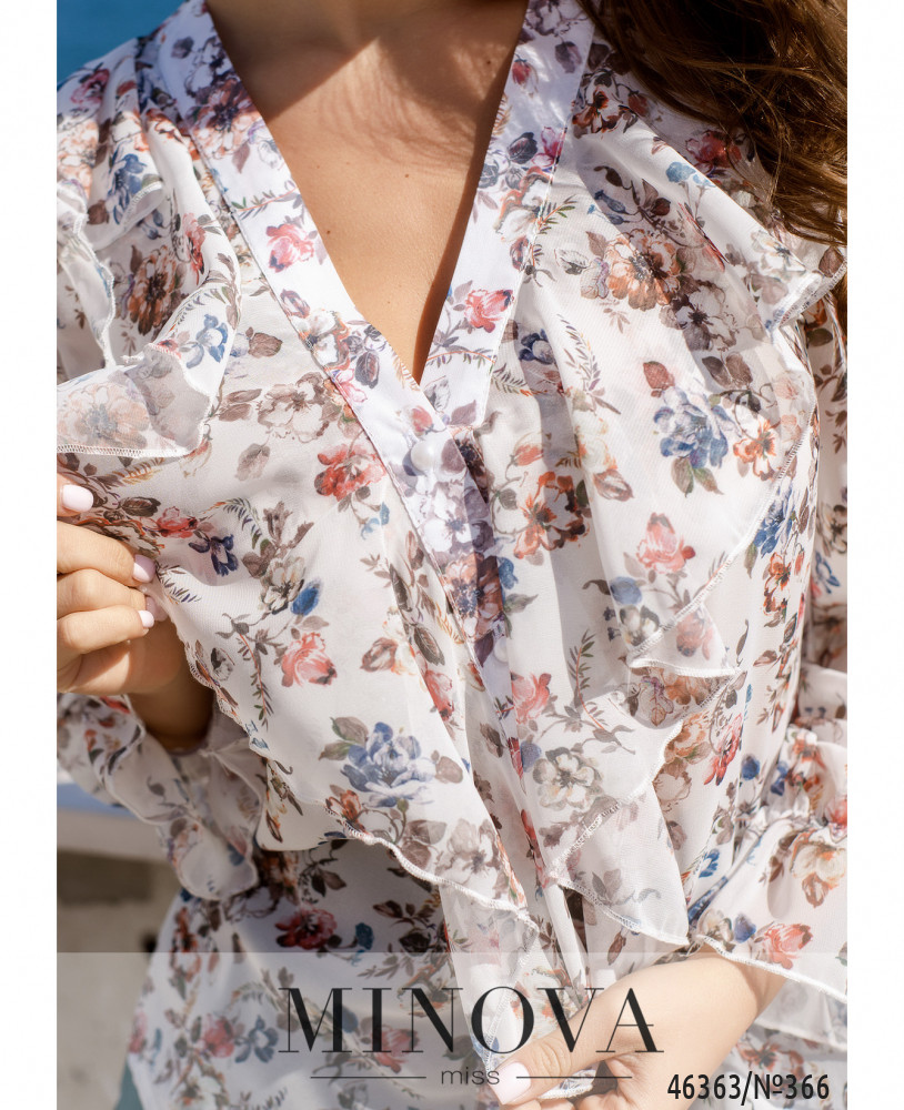 Легкая полупрозрачная шифоновая блуза без подкладки, выполненная из тонкого шифона с актуальным цветочным принтом, способна придать очертаниям фигуры мягкости и естественности. Модель дополнена воздушными оборками спереди по линии декольте, а также на рукавах с резинками вместо манжет. Блуза застегивается на ряд пуговиц спереди.