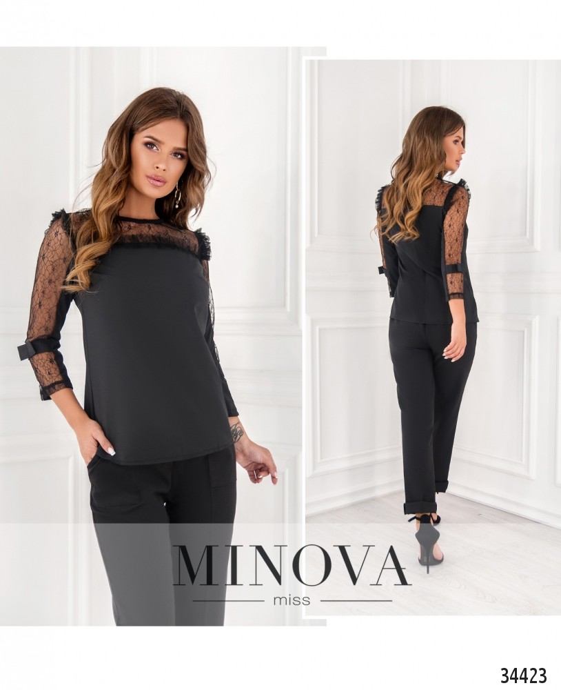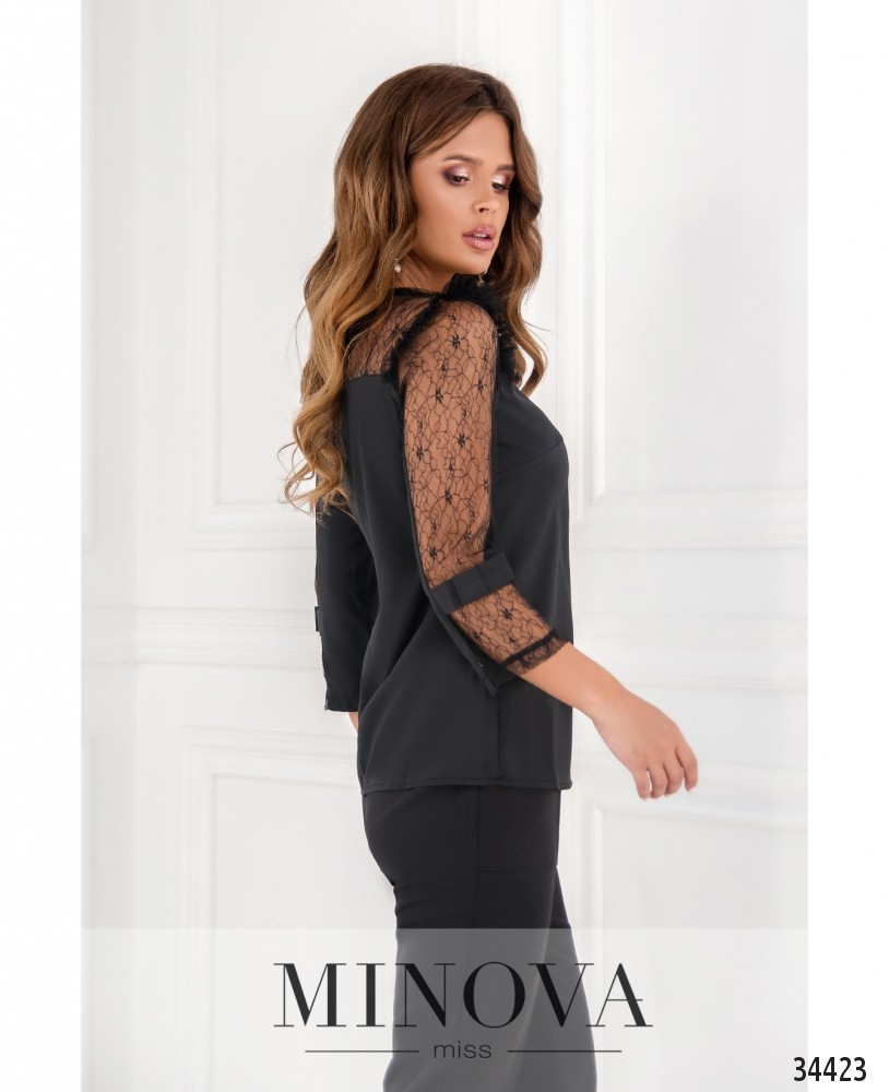 Нарядная и нежная блузка из каталога женской одежды от Minova придаст вашему официальному наряду нотку женственности и элегантности. Блуза из очень лёгкой ткани, украшена вставками тонкого гипюра на плечах, а рукава выполнены полностью из гипюра без подкладки и украшены тканевыми лентами-бантами чуть выше манжета. На груди – поперечные вытачки, застёгивается блуза на небольшую пуговку под шеей. В каталоге представлены классические цвета: чёрный и белый. Вы можете сочетать их с деловыми брюками, юбкой или даже с тёмными прямыми джинсами. Оттенить образ помогут яркие аксессуары. Блуза будет особенно удачно смотреться на фигуре типа «груша» или «яблоко».