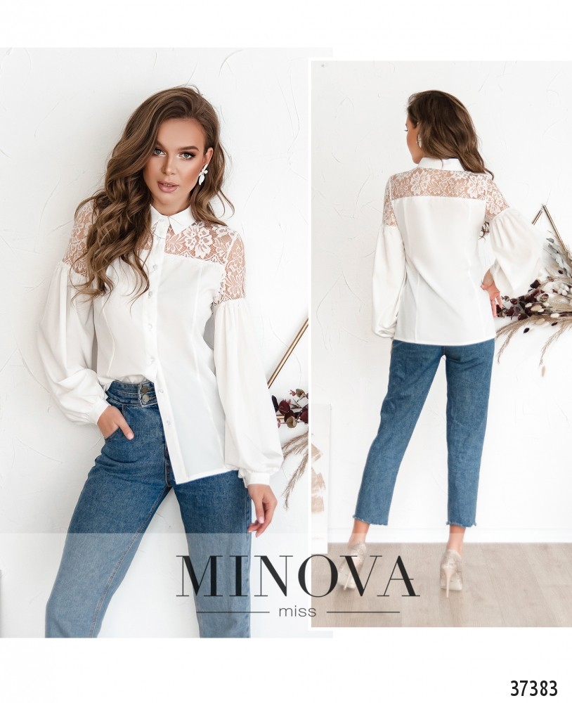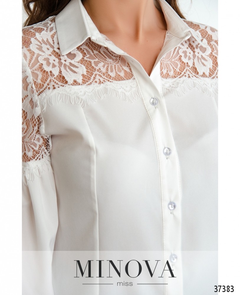 Праздничная рубашка из лёгкой ткани, украшенная кружевом на плечах и спине сверху. По центру – планка с полным рядом пуговиц. Рукава с небольшими манжетами, на манжетах по одной пуговице. Подшиты к кружеву и присобраны. Спереди и по спинке – продольные вытачки. Воротничок отложной.