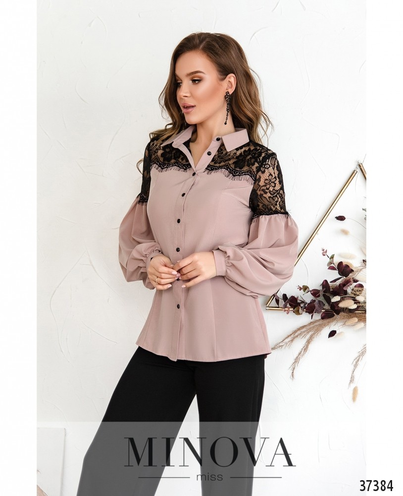 Праздничная рубашка из лёгкой ткани, украшенная кружевом на плечах и спине сверху. По центру – планка с полным рядом пуговиц. Рукава с небольшими манжетами, на манжетах по одной пуговице. Подшиты к кружеву и присобраны. Спереди и по спинке – продольные вытачки. Воротничок отложной.