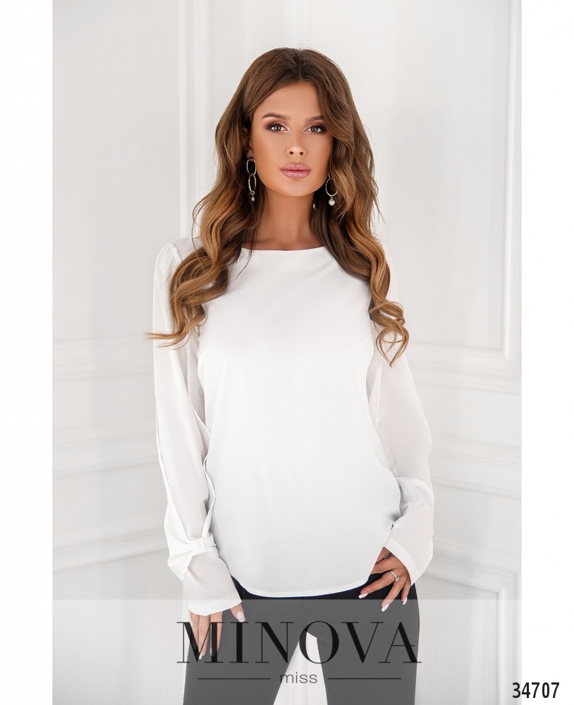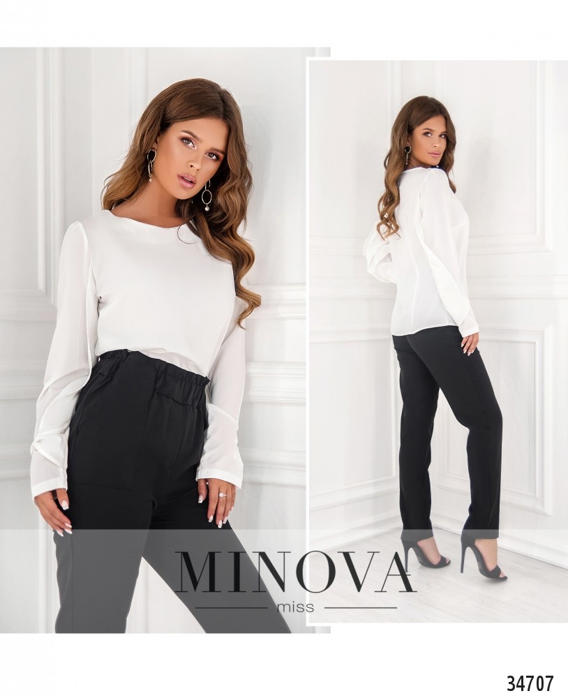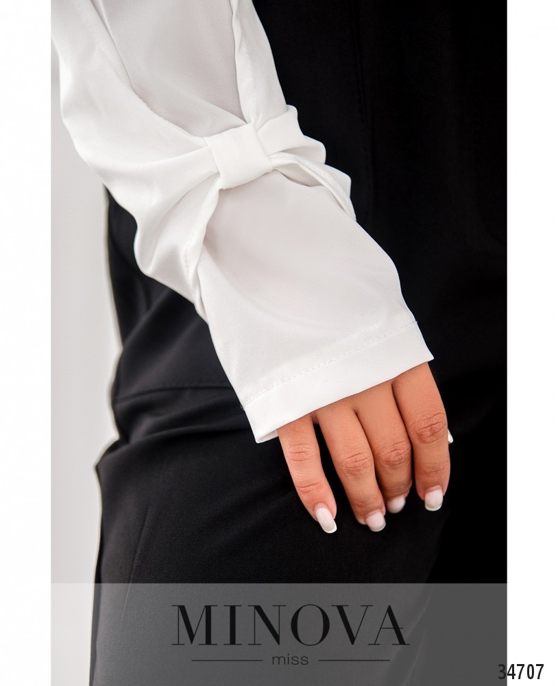 Казалось бы, что необычного в простой и строгой блузе? Но Minova умеет удивлять и радовать небольшими дизайнерскими экспериментами! Представленная в новом каталоге модель блузы свободного кроя выполнена без застёжек и карманов, вырез горловины широкий, полукруглый, рукава полной длины, без манжет, но они как бы двухслойные: основной рукав прямой, но его охватывает ещё один слой, присобранный на уровне манжета и завязанный в виде крупного банта. Это небольшое дополнение делает представленную блузу нарядной и элегантной. На груди – небольшие диагональные вытачки снизу вверх. Блузу свободного кроя лучше носить навыпуск с брюками или юбкой прямого кроя длины миди. Украшение не входит в комплект. Пояс/аксессуар не входит в комплект.