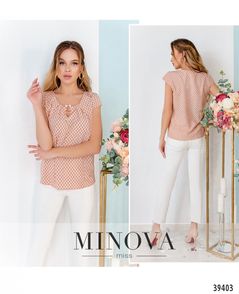 Элегантная минималистичная блуза плюс сайз с рукавом-лепестком, вырез горловины полукруглый, украшен золотистой "подковкой" с "жемчужными" бусинами. Ткань спереди присобрана, карманов и застёжек нет.