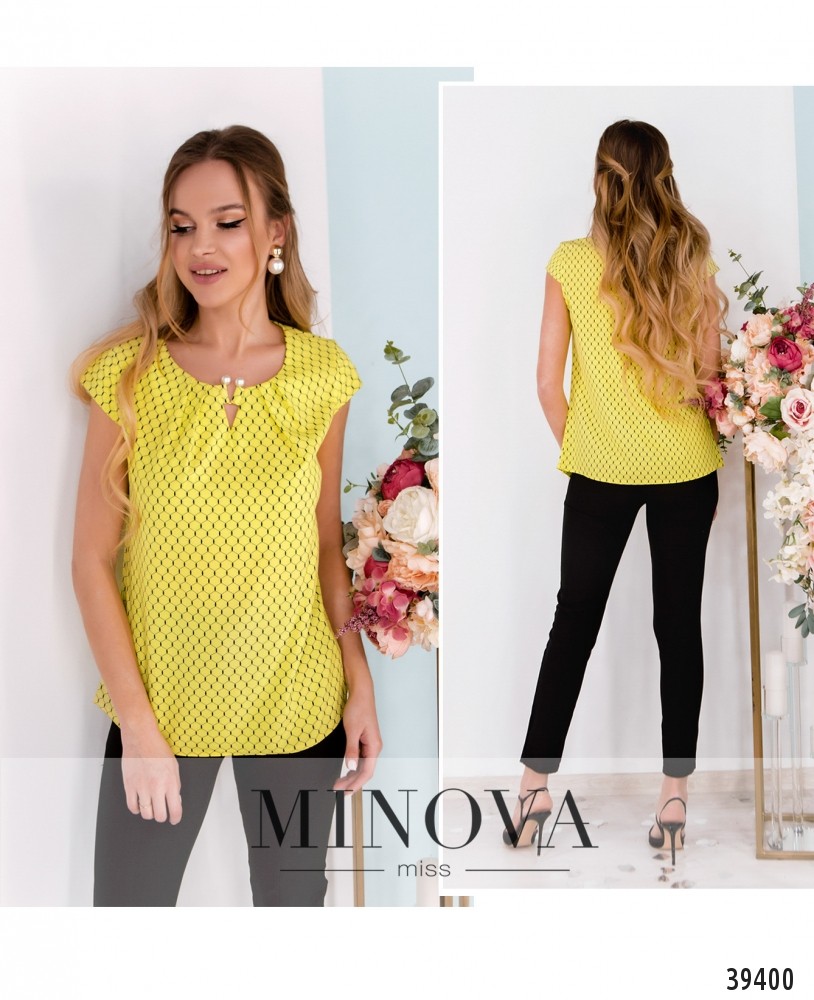 Элегантная минималистичная блуза плюс сайз с рукавом-лепестком, вырез горловины полукруглый, украшен золотистой "подковкой" с "жемчужными" бусинами. Ткань спереди присобрана, карманов и застёжек нет.