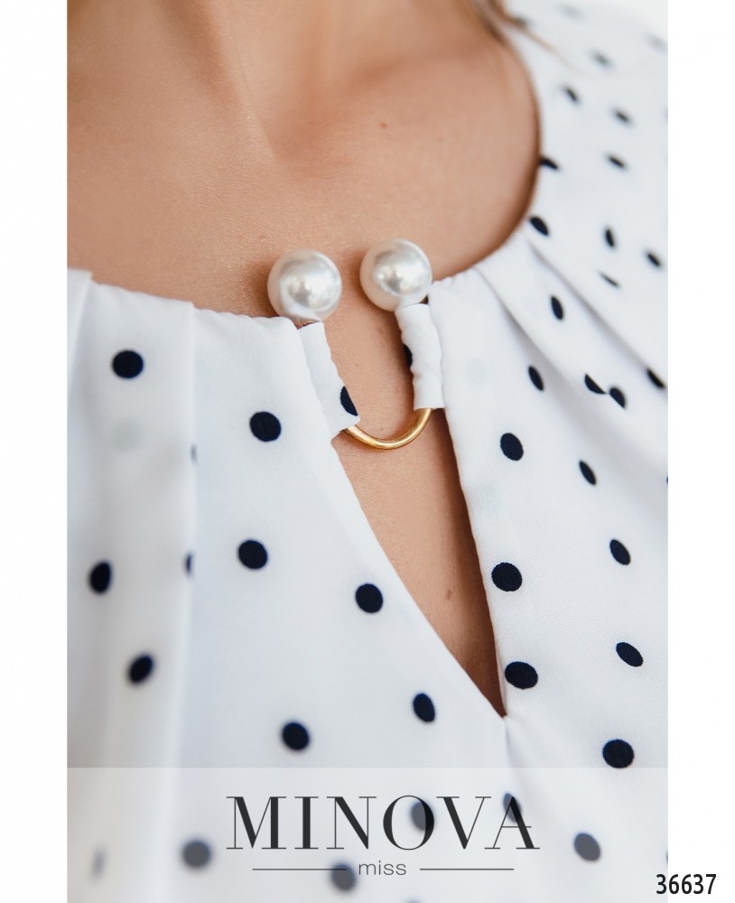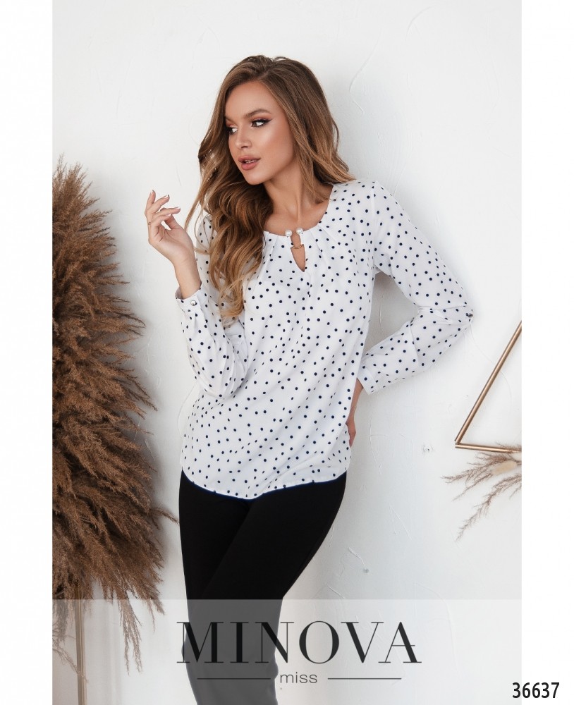 Лёгкая, воздушная, очень нарядная блуза на каждый день или на праздник – в зависимости от того, какой оттенок или принт ты выберешь. В каталоге Minova представлены модели в принт «шестиугольник», в горошек и однотонные. Цвета – пастельные, яркие или классические. Блуза без застёжек и карманов, рукава полной длины, с небольшими манжетами, на манжетах – по одной пуговке. Регулируются на пуговку и ленту. Вырез горловины полукруглый, неглубокий, спереди ткань присобрана и закреплена очаровательной металлической «брошкой» с «жемчужными» наконечниками. Блуза свободного кроя, её лучше носить навыпуск.