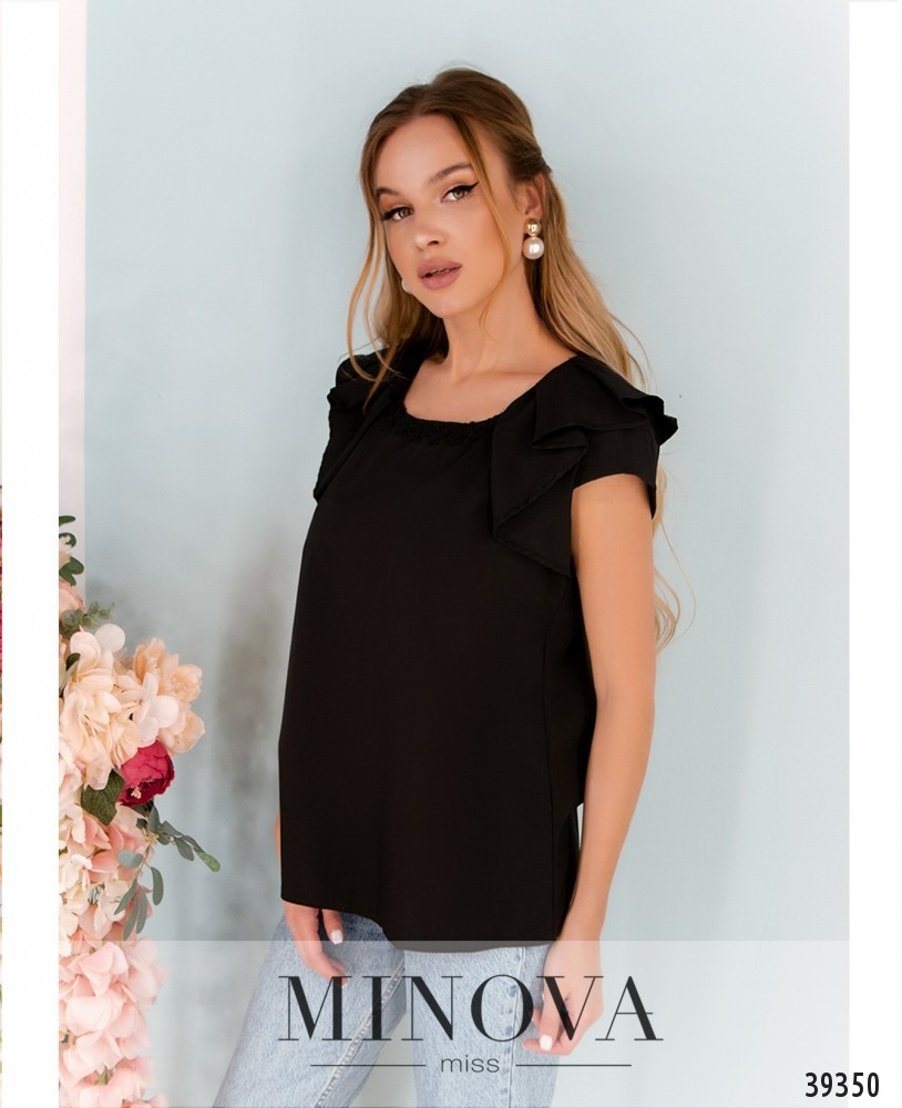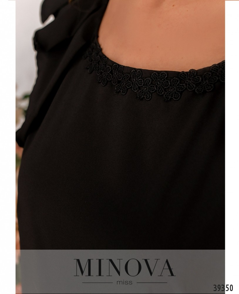 Строгая, но нарядная блуза с рукавом-воланом, вырез горловины полукруглый, украшен тонкой полоской кружева. Карманов и застёжек нет. Крой свободный.