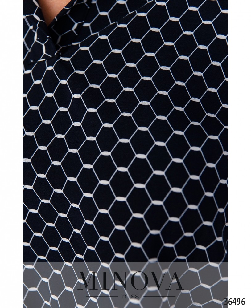 Асимметричный подол делает блузку более интересной – и Minova часто использует эту фишку в своих моделях! Представленная в новом каталоге модель лёгкой блузы присобрана спереди, сзади подол чуть длиннее. В остальном блузка довольно простая и лаконичная: отложной воротничок без застёжек, рукава длиной ¾, с манжетами и пуговкой на манжете. Карманов нет. Интересный принт и приятная расцветка делают модель необычной и подходящей для твоего базового гардероба. Особенность кроя будет удачно скрывать некоторые несовершенства фигуры. Сочетай её с брюками или джинсами, можешь носить навыпуск или заправлять.