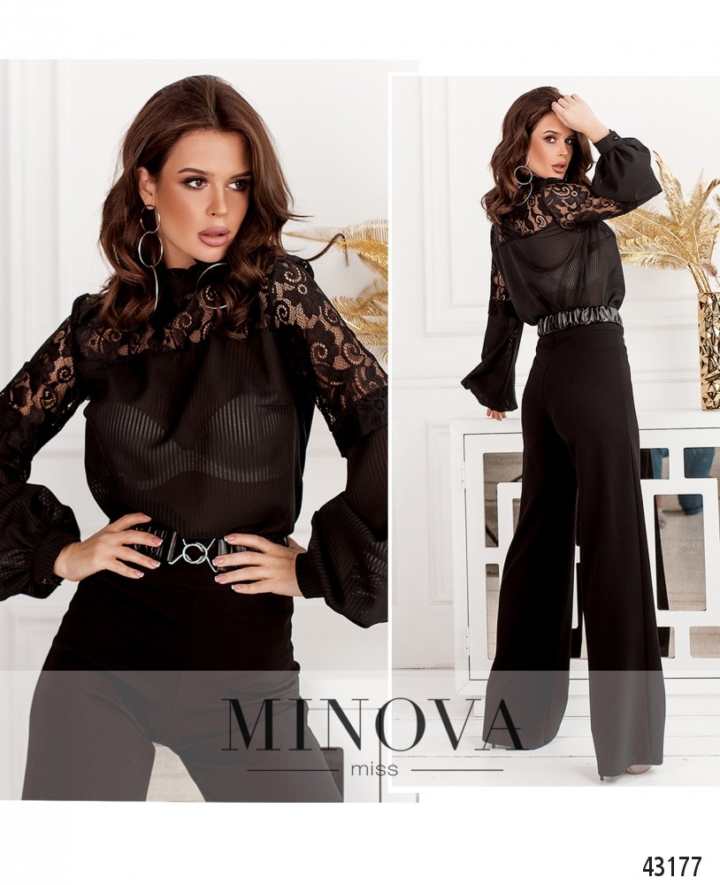 Стильная рубашка с кружевом на верхней части плеч и груди, а также на спинке. Карманов нет. Рукава епископские с плотной нижней частью, с манжетами, на манжетах по одной пуговице. Воротник с оборками. Застёгивается на пуговку сзади под шеей. На груди вытачки.