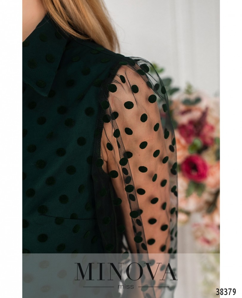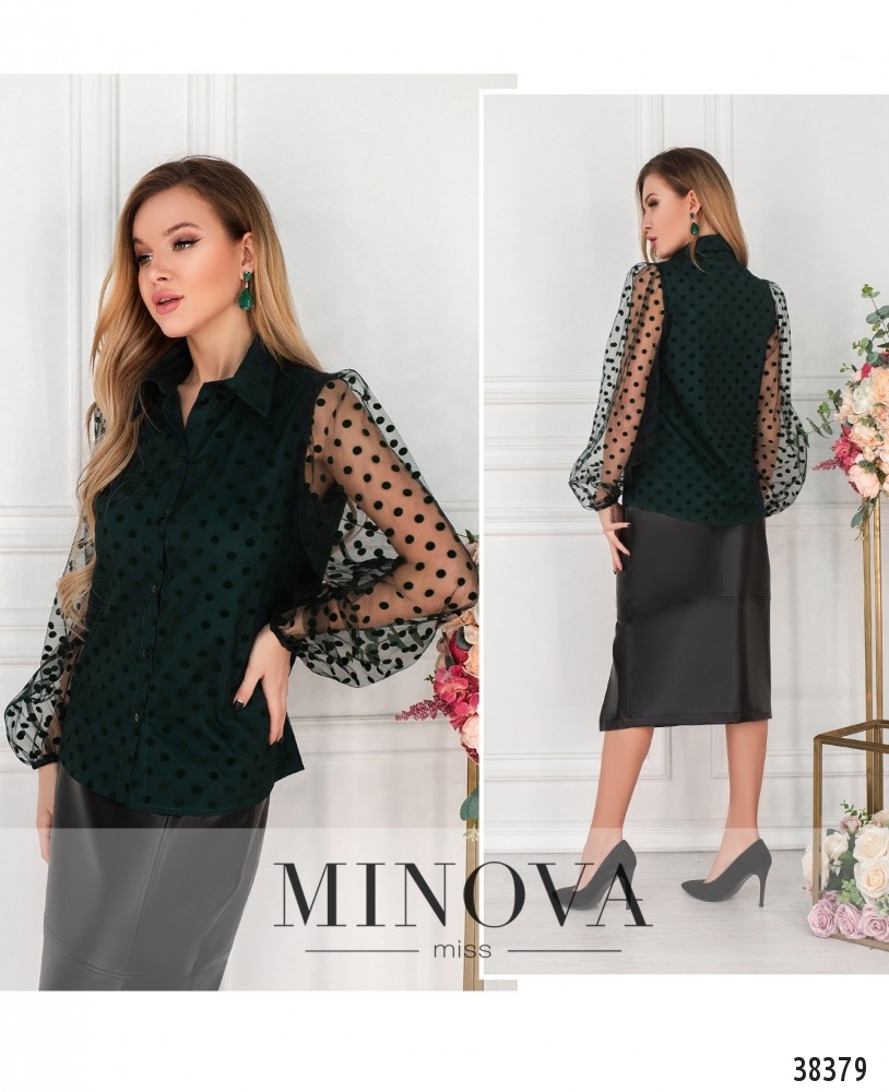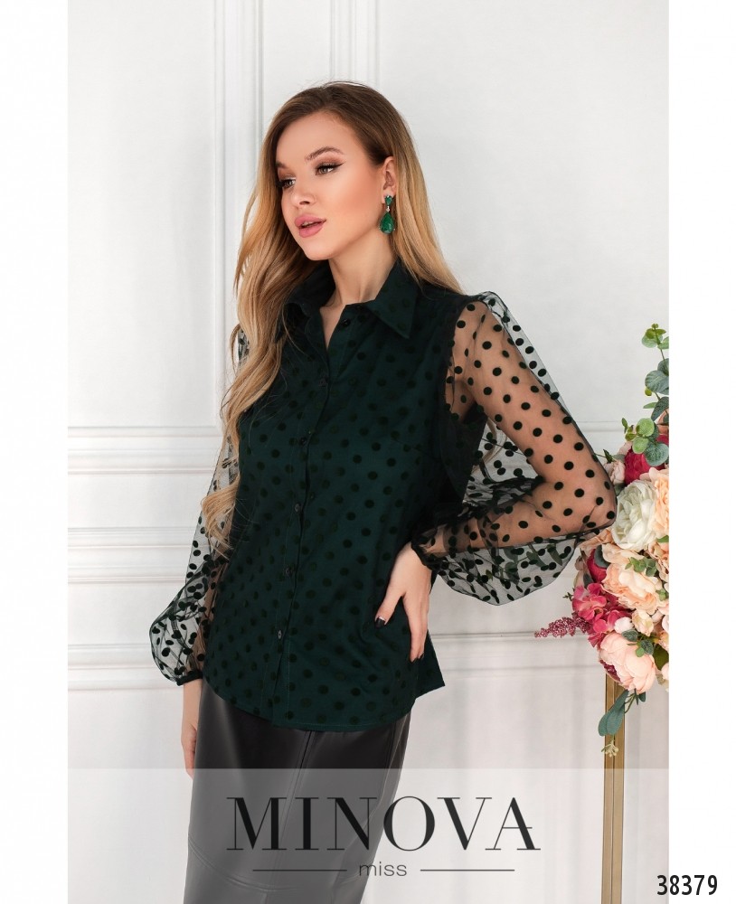 Стильная рубашка с отложным воротничком и рядом пуговиц на планке. Основная часть с мягкой подкладкой, сверху – сеточка в бархатную клетку. Рукава без подкладки, в манжеты вшита резинка.