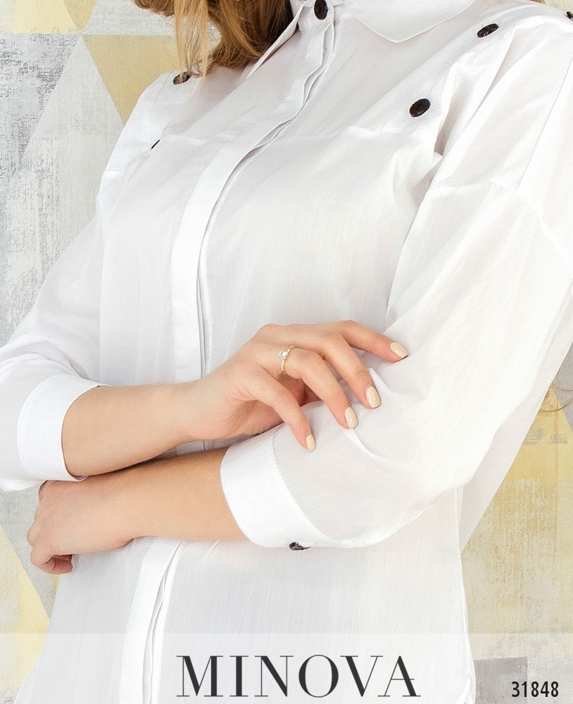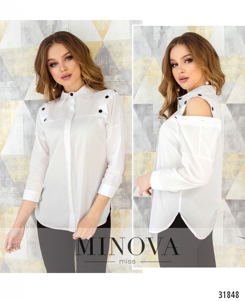 Рубашка с вырезами на плечах и рукавами ¾. Рубашка прямого кроя с отрезной кокеткой. На плечах вырезы застегиваются на пуговицы. На лицевой стороне рубашка застегивается на пуговицы, спрятанные в планке. Рукава собраны в манжеты и застегиваются на пуговицы. Подол закруглен.
