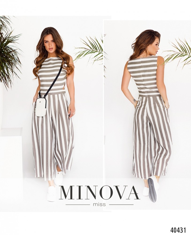 Элегантный полосатый комбинезон с брюками, верх закрытый, по бокам на талии - оригинальные треугольные вырезы. Застёгивается на молнию, вшитую по спинке. На талии - небольшие декоративные складки. По бокам - врезные карманы. Вырез горловины полукруглый. На груди вытачки.