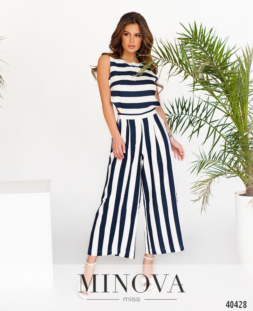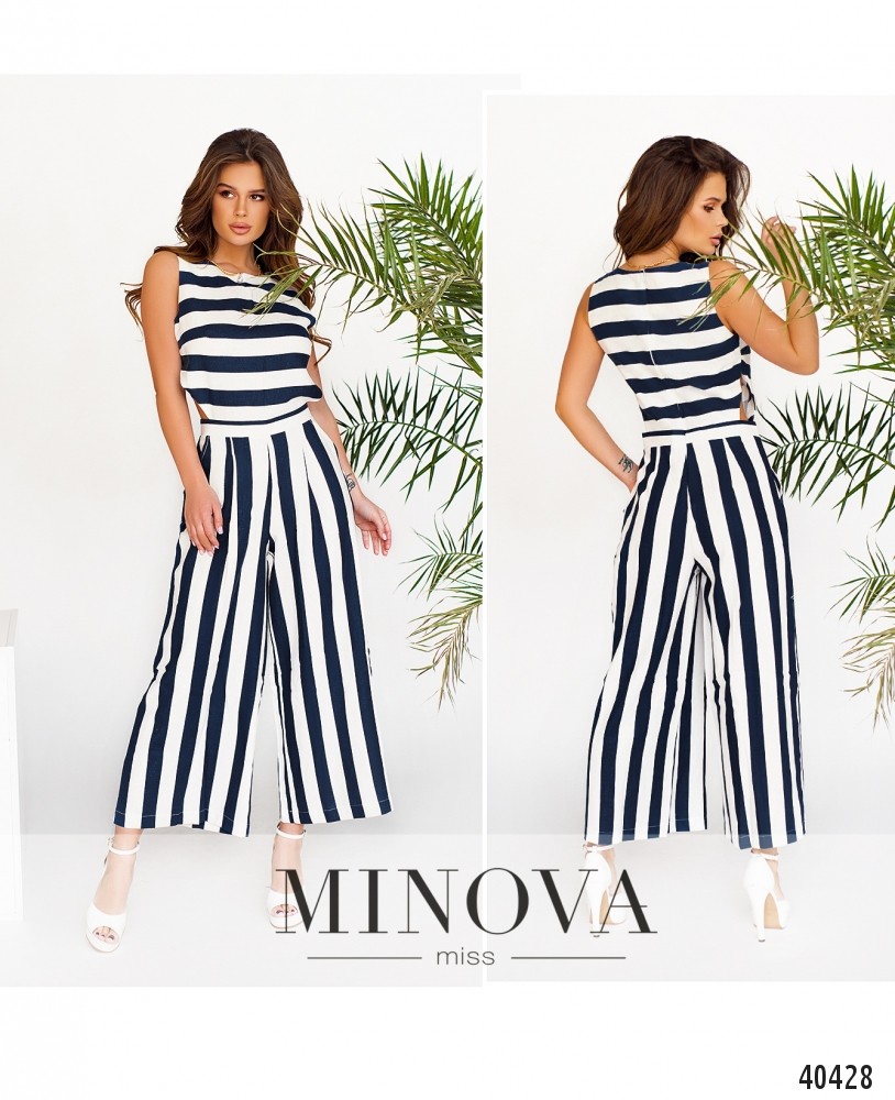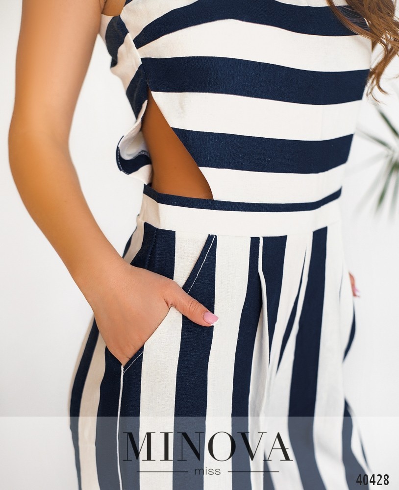 Элегантный полосатый комбинезон с брюками, верх закрытый, по бокам на талии - оригинальные треугольные вырезы. Застёгивается на молнию, вшитую по спинке. На талии - небольшие декоративные складки. По бокам - врезные карманы. Вырез горловины полукруглый. На груди вытачки.
