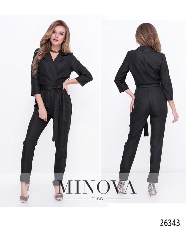 Стильный комбинезон, который подойдет как на повседневную носку, так и на праздничное мероприятие, в зависимости от аксессуаров. Топ на запах и с отложенным воротником, который крепиться на двух потайных пуговицах и дополняется поясом. Рукава ¾. Брюки зауженного кроя на молнии, по бокам два кармана.