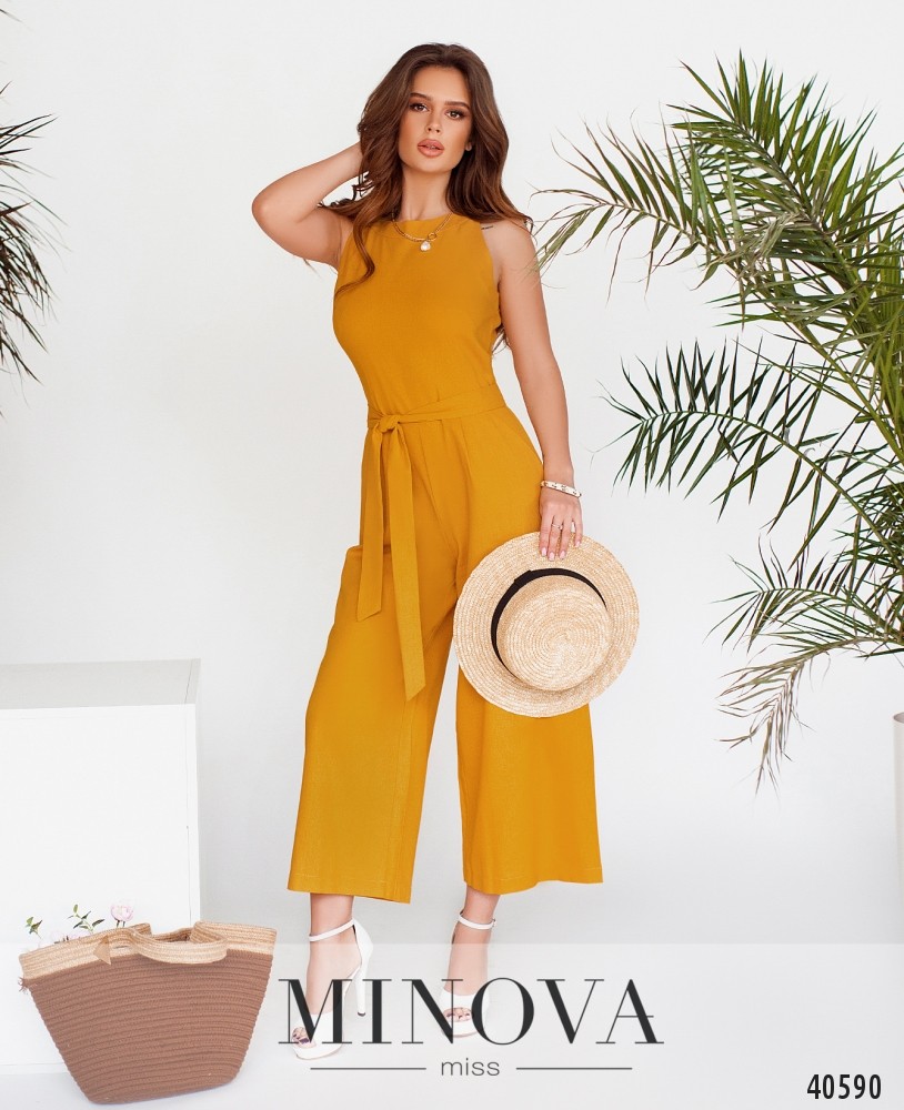 Минималистичный и очень привлекательный комбинезон с закрытым передом и спинкой, без рукавов, по бокам - врезные карманы, застёгивается на вшитую по спинке молнию. Брюки расклешённые. На груди - скульптурирующие вытачки.