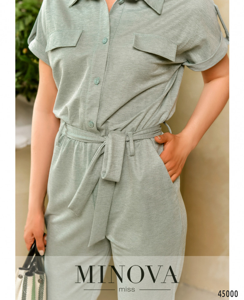 Стильный комбинезон с отложным воротничком и декоративными клапанами на груди. По бокам - карманы в шве с косым срезом. Рукава с рабочей регулировочной лентой и пуговкой, с небольшими подворотами. На брючинах также небольшие подвороты. В пояс вшита резинка, нашиты шлейки для пояска. Застёжка - пуговицы от воротничка до талии.