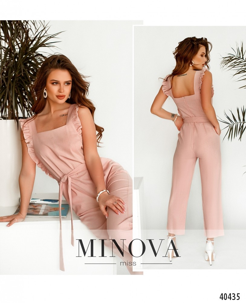 Нежный, очень удобный комбинезон с оборками на бретелях и до талии. В комплекте пояс. Застёгивается на молнию, вшитую по спинке. По бокам - врезные карманы, на груди вытачки. Пояс/аксессуар входит в комплект.