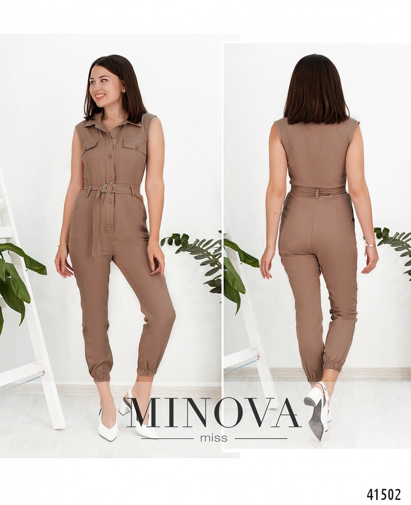 Оригинальный комбинезон в "рубашечном" стиле, с отложным воротничком и рядом пуговиц спереди на планке. На груди - декоративные клапаны с пуговицами. По бокам на бёдрах - врезные карманы. В брючины снизу вшиты резинки. В комплекте пояс, который продевается через шлейки на талии. Силуэт приталенный.