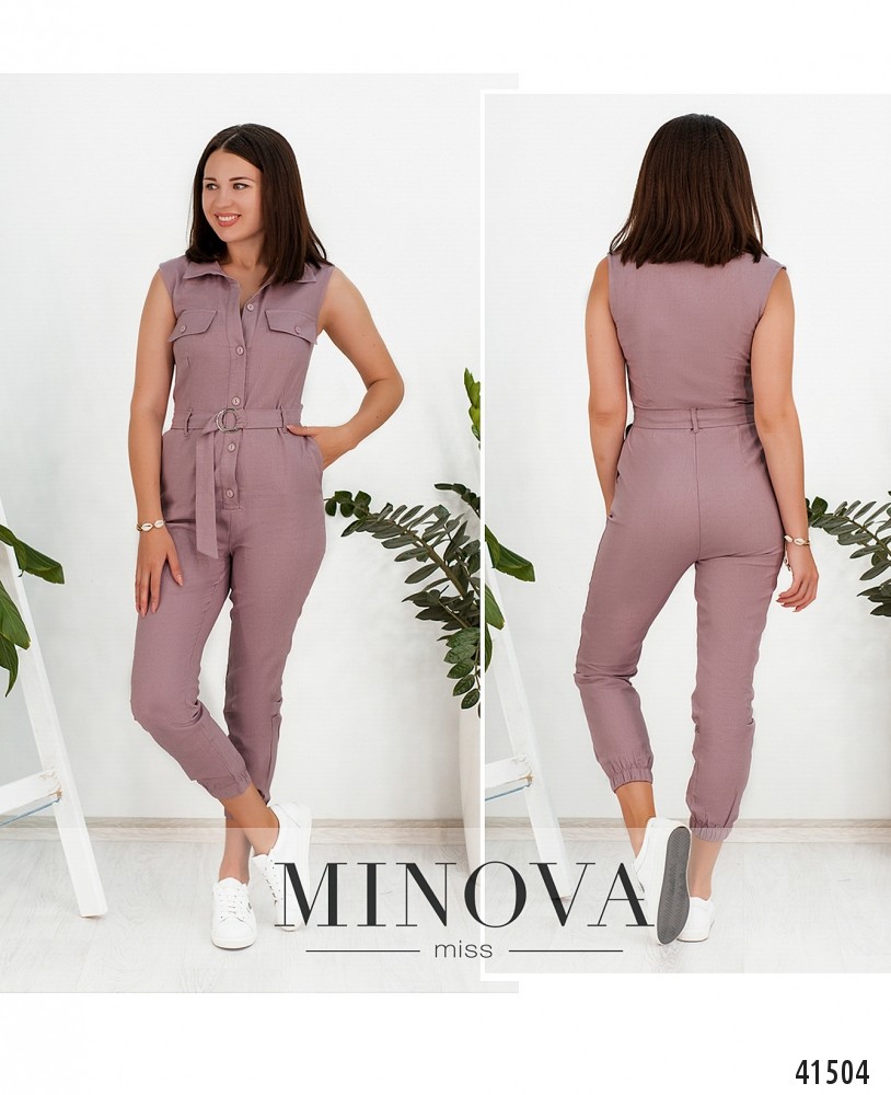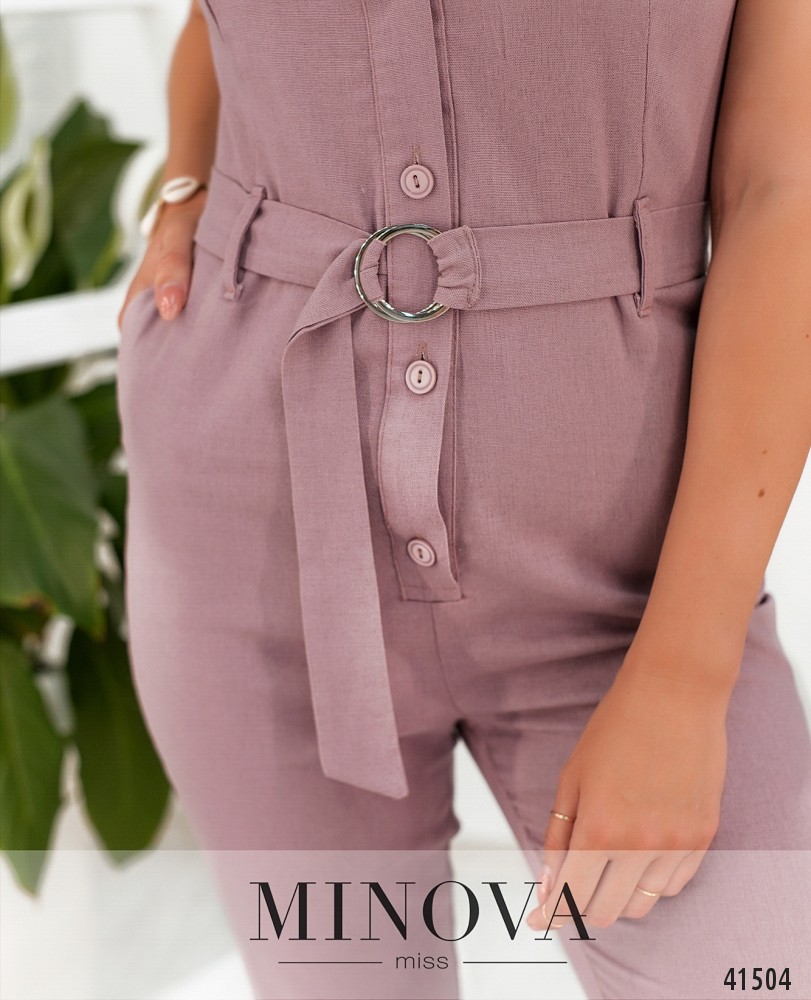 Оригинальный комбинезон в "рубашечном" стиле, с отложным воротничком и рядом пуговиц спереди на планке. На груди - декоративные клапаны с пуговицами. По бокам на бёдрах - врезные карманы. В брючины снизу вшиты резинки. В комплекте пояс, который продевается через шлейки на талии. Силуэт приталенный.