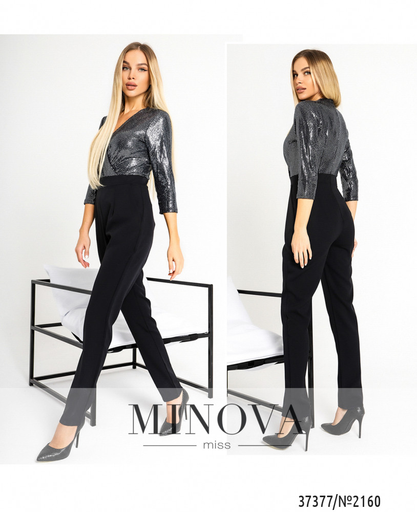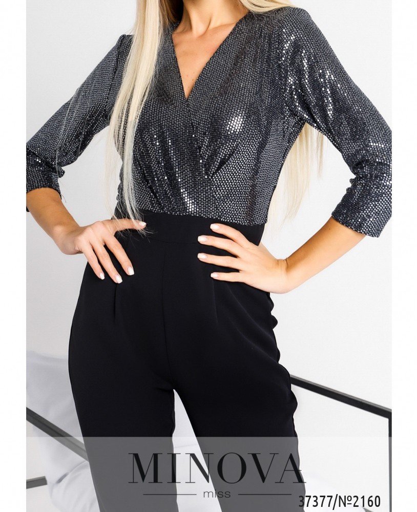 Нарядный приталенный комбинезон с длинными брюками. Верх подшит на запАх и декорирован пайетками спереди и по спине. Рукава с пайетками. По бокам – прорезные карманы, застёжка – потайная молния на спине. Сзади продольные вытачки.