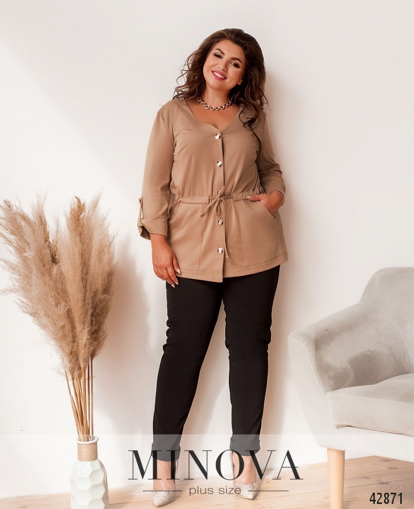 Минималистичный костюм большого размера с блузой и брюками. Брюки с высокой талией и врезными карманами по бокам, в пояс сзади вшита резинка, снизу - манжеты. Блуза с V-образным вырезом горловины, застёгивается на пуговицы, на талии шнурок, пропущенный под кулиской. На рукавах подшиты декоративные регулировочные ленты. На груди вытачки. По бокам - врезные карманы.