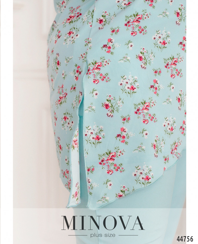Оригинальный костюм плюс сайз, блуза с асимметричным подолом и ярким принтом, без карманов и застёжек, справа на подоле небольшой разрез. Рукава короткие фасона "летучая мышь". Вырез горловины полукруглый. Брюки с высокой талией, без застёжек, по бокам - карманы в шве, в пояс вшита резинка.