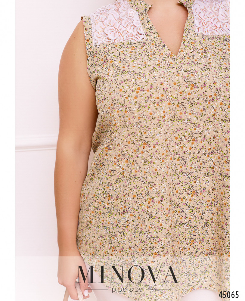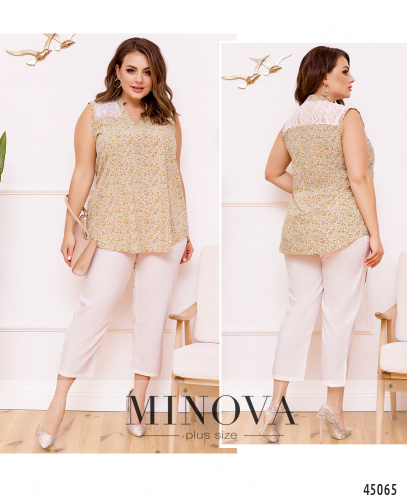 Комфортный костюм в стиле casual с яркой блузой и светлыми брюками позволит выглядеть эффектно в жаркий летний день. Изящная блуза свободного кроя с воротником-стойкой, v-образным вырезом и кружевными вставками на плечах и укороченные брюки-капри с высокой талией на резинке, без застежек, с карманами в швах – это идеальный вариант для прогулки или встреч с друзями.